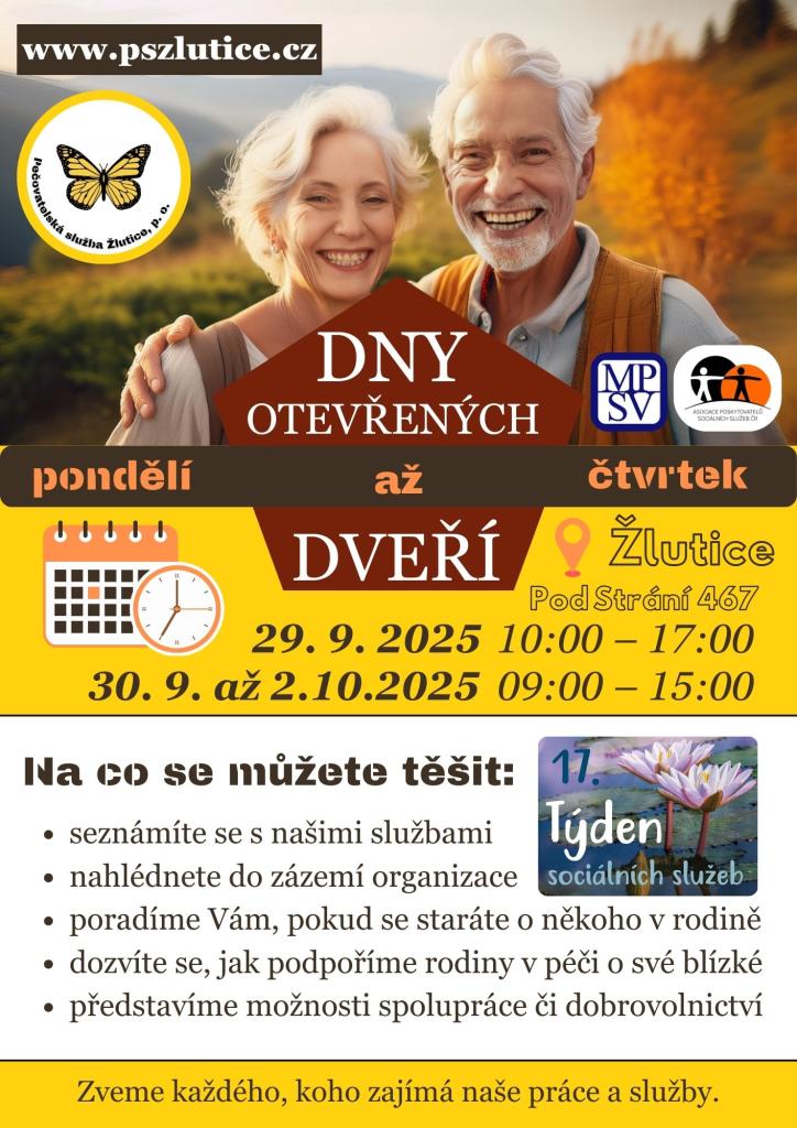 Ve dnech 29.9.2025 až 2.10.2025 proběhnou dny otevřených dveří Pečovatelské služby Žlutice.
