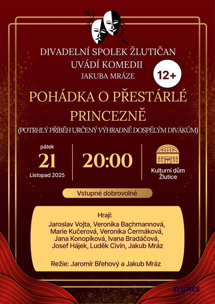 Divadelní spolek Žlutičan uvádí komedii Jakuba Mráze nazvanou "Pohádka o přestárlé princezně". Představení je určeno výhradně pro dospělé diváky a nabídne potrhý příběh plný humoru. Akce se uskuteční v pátek 21. listopadu 2025 ve 20:00 v Kulturním domě v Žluticích. Hrají například Jaroslav Vojta,