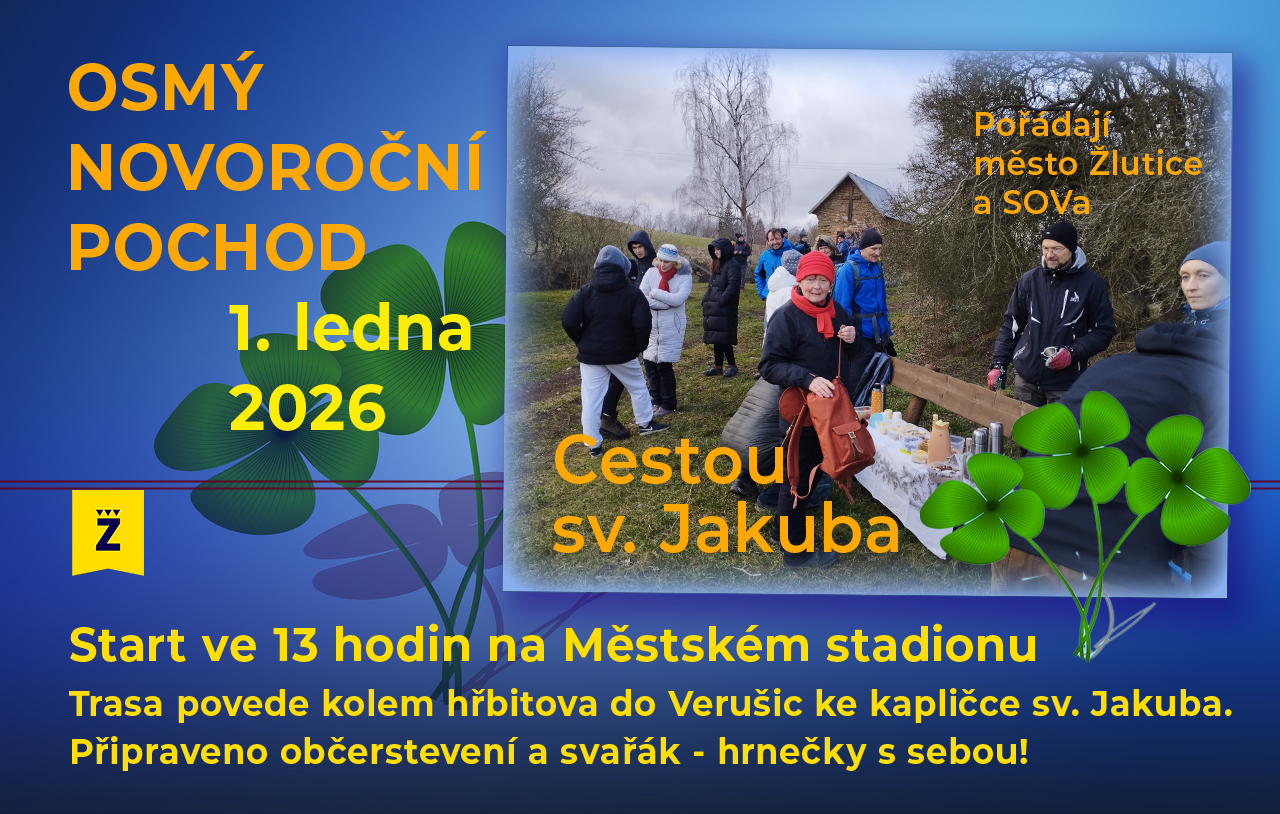 Start na městském stadionu ve 13 hodin. Trasa: kolem kostela sv. Mikuláše do Verušis ke kapličce sv. Jakuba. Občerstvení bude. Hrnečky s sebou!